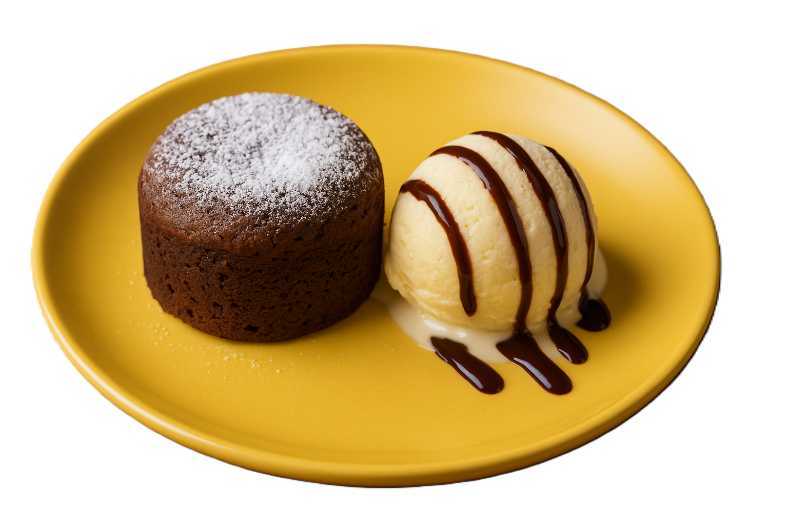 Coulant de chocolate, con helado de vainilla y sirope de chocolate.