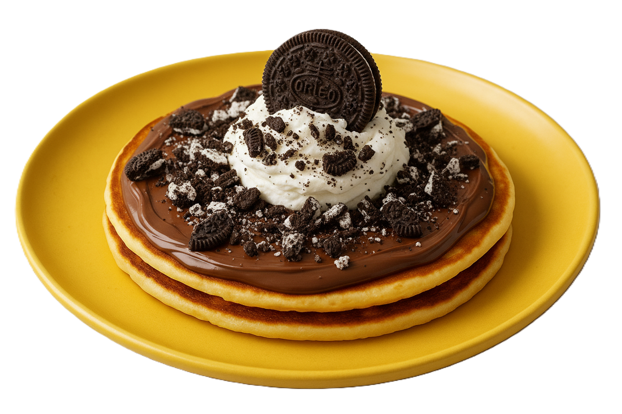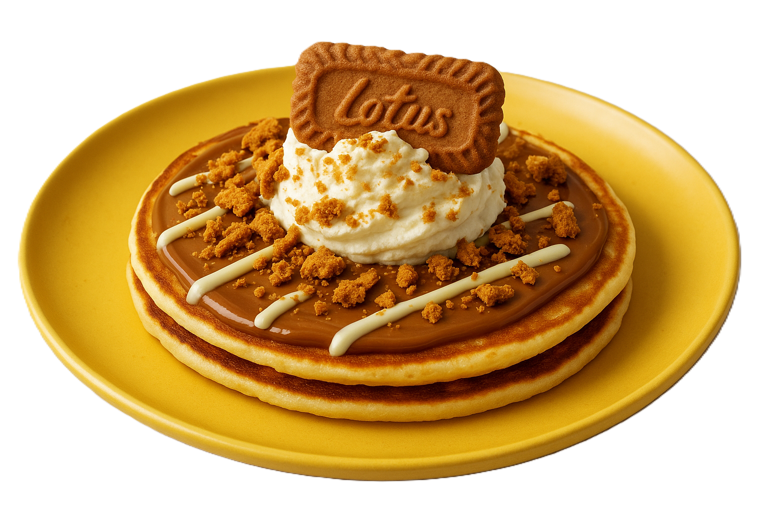 Pancakes con crema de Lotus, chocolate blanco, nata ya galleta Lotus.