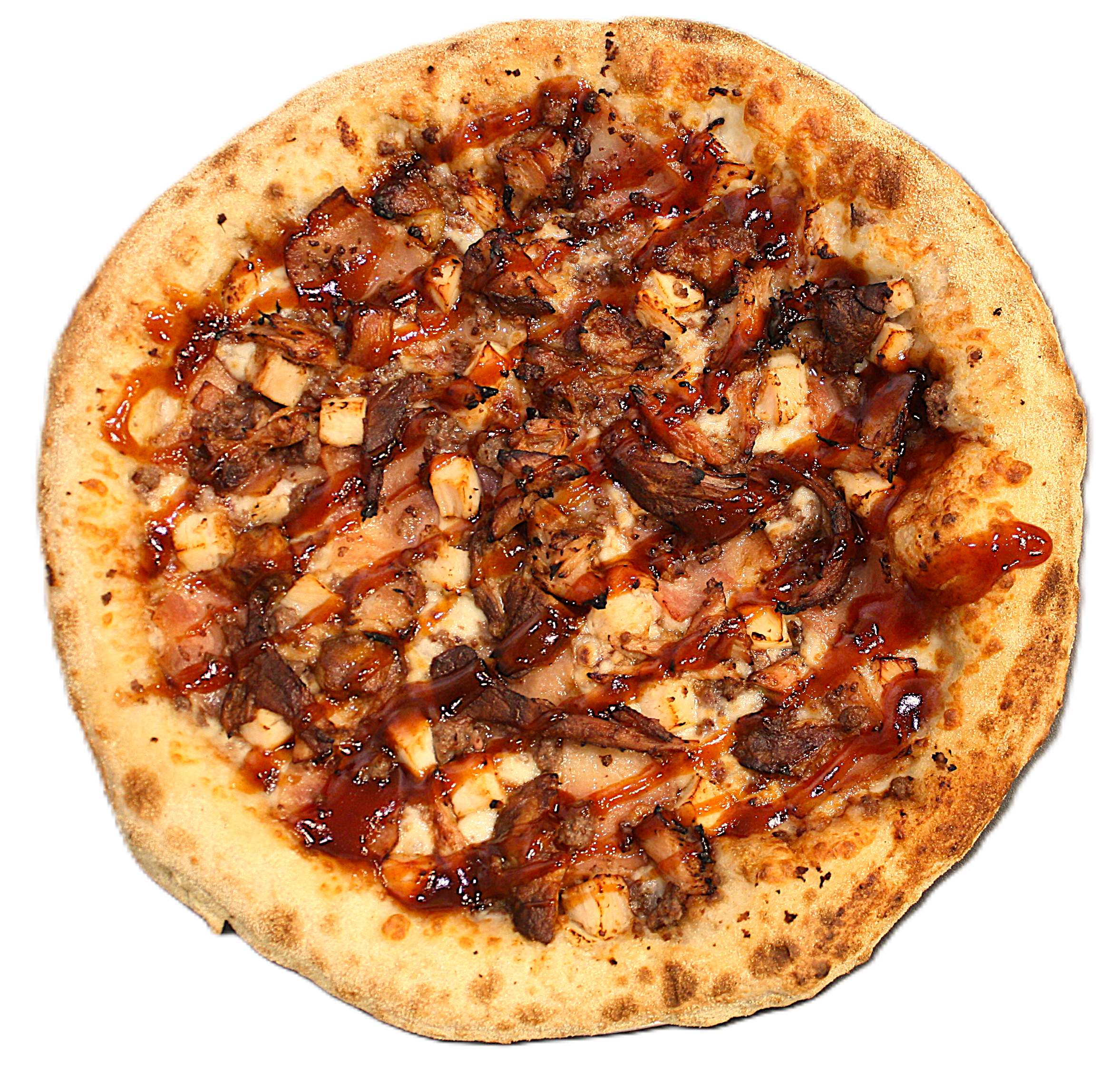 Salsa barbacoa, mozzarella, bacon, ternera asada y pollo asado.
